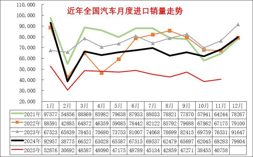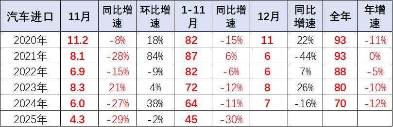 2025年1-11月進口汽車45萬輛,同比下降30%,這是近期少見的1-11月巨大下滑。其中11月進口車4.3萬輛,同比下滑29%,環比10月下降2%。2024年汽車進口70萬輛,同比下降12%。隨著國產車的崛起和國際品牌本土化加速,近幾年汽車進口持續低迷,進口車持續3年負增長,如果熨平波動,則是連續7年的負增長。