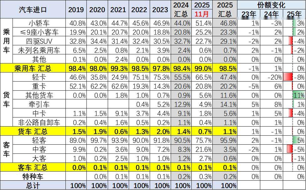 乘用車中2025年1-11月進口轎車占比47%;進口四驅SUV進口占比29%;而新能源車的未列名機動車進口占比1%。2025年的商用車進口表現一般,尤其是輕卡進口下滑較大,但牽引車和中卡等均不強。近期的進口皮卡也很弱。
